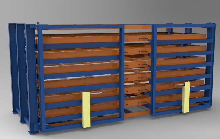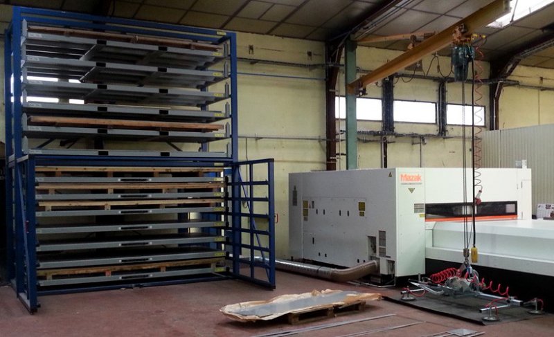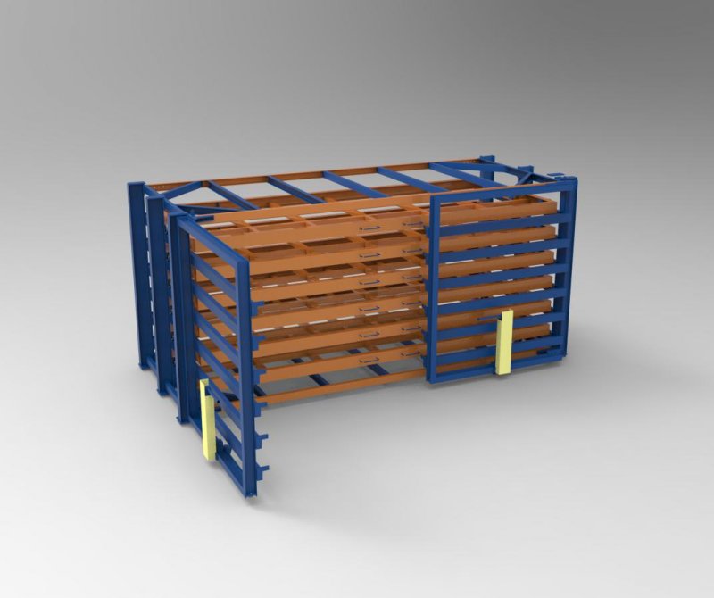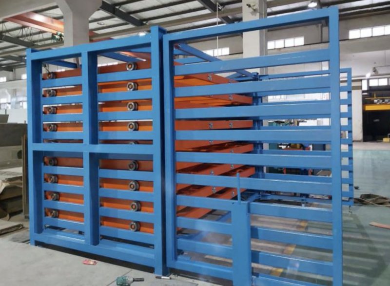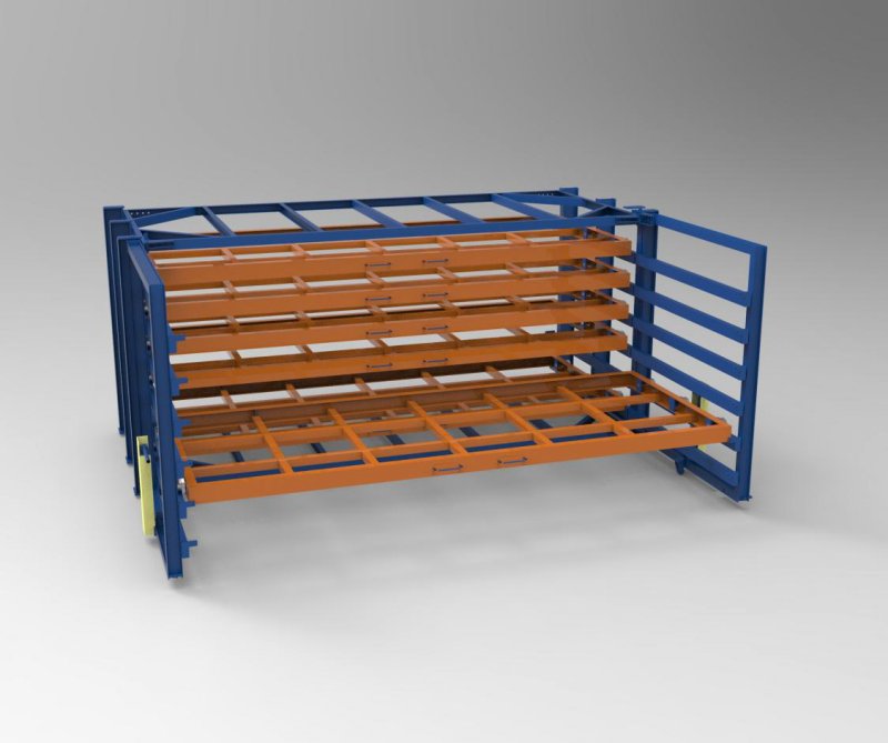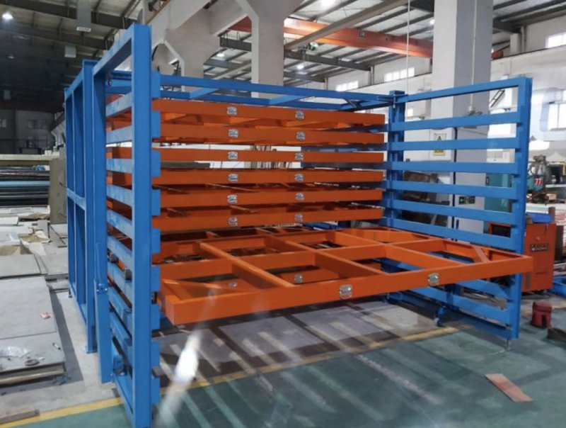 板材存放架采用抽屜式結(jié)構(gòu),一組貨架分為8層,可以存放8種板材,只占用一種板材的存儲(chǔ)空間,提高8倍的存儲(chǔ)量,每層都能單獨(dú)伸出使用,使用吊車(chē)吊裝板材,保護(hù)人員安全不被劃傷,也保護(hù)板材卷邊 變形。
